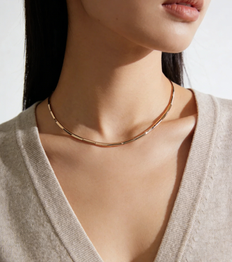 The golden rule? Match your base to your neckline. A sleek choker shines with low necklines (V-necks, scoop necks, off-the-shoulder) by drawing attention to your collarbone, while a dainty fine chain is the ideal pick for higher necklines (crewnecks, turtlenecks, mock necks) — it adds elegance without overwhelming the fabric.